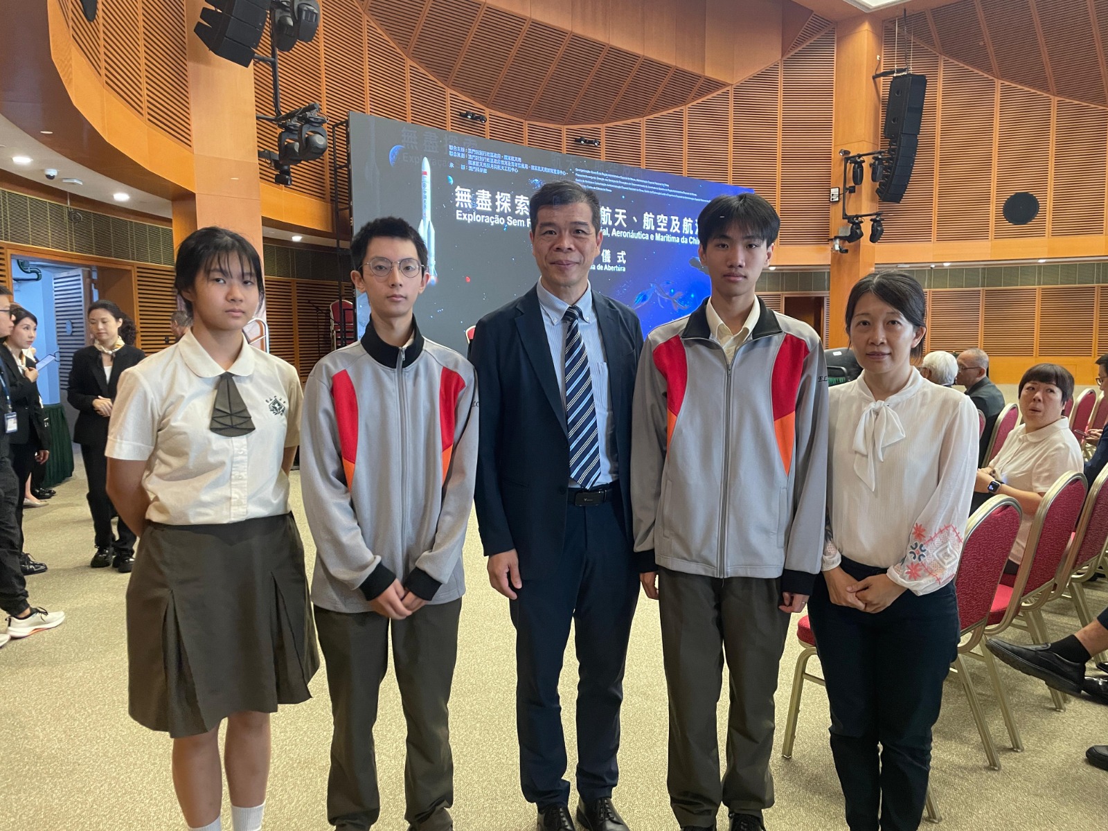 為讓學生深入了解國家在航天、航空及航海領域的最新發展,激發青年對科技創新的興趣,本校高一電子班黃諾柔、高二資訊班李恆文與黃曉鋒三位同學,於2025年9月29日上午,在陳盛疇校長的帶領及林瀾老師的帶隊下,參加於澳門科學館舉行的“無盡探索——中國的航天、航空及航海”展覽開幕式。該活動由澳門特別行政區政府與國家航天局聯合主辦。
