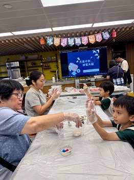 為讓學生及其家長亦可一同感受節日氣氛,日前三學部一同舉辦有關親子月餅製作活動,該活動由家長會會長、副會長、各理事及老師等帶領及協助下,一同製作卡通冰皮月餅,透過活動過程鍛鍊學生的小手肌肉,並促進親子間的互動關係。