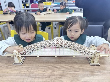 小朋友們集懷着學習科學的心情,眼睛閃亮地聆聽從古至今科學家的貢獻故事,並親手觸摸橋梁模型,臉上洋溢著滿滿的求知笑容。
