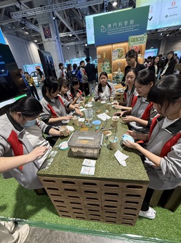 高二信班更重點參觀澳門科學館展位,參與三款互動遊戲:“碳中和大挑戰”模擬碳排與減碳的平衡;“綠點校園環保卡牌”從衣、食、住、行啟發可持續生活思考;“Trash is Fun”以趣味挑戰提升回收意識。