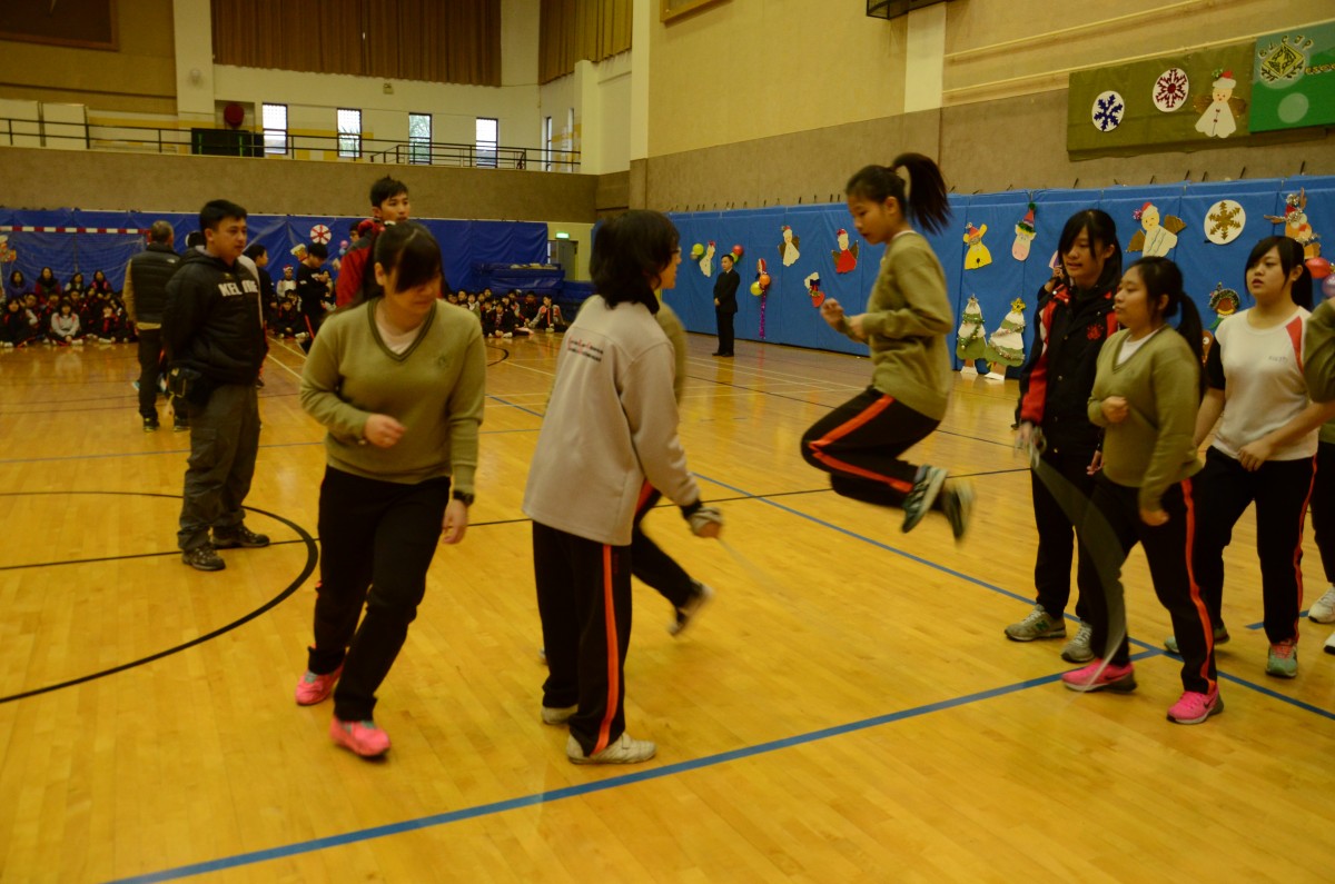 接著,令全體師生熱情澎湃的班際跳大繩比賽正式開始,進入決賽的隊伍昂首闊步、雄赳赳地進場。在此起彼落的歡呼聲中,初中組各隊伍步步為營、小心翼翼,以穩中求勝的策略順利完成比賽,冠、亞、季軍分別由初三文、初三忠和初二行班奪得。高中組各隊伍勢均力敵,一時難分高下;當裁判宣佈比賽時間只剩30秒時,高二翻譯班如有神助、越戰越勇,力壓群雄、脫穎而出,勇奪冠軍!賽前呼聲最高的高三商文班因為連番失誤只好屈居亞軍,高二電子得季軍。